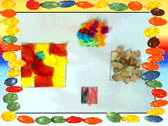 São quadrados e quadradinhos de vários tamanhos. Utilizamos material diferente em cada um: papel seda aos pedaços, bolinhas de papel crepe, lápis de cor e aparas de lápis.